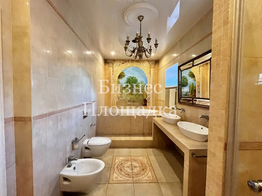 2й этаж:- холл второго этажа - на полу уложен ламинат, стены оклеены обоями, потолок многоуровневый из ГКЛ с точечными светильниками, нишей с подсветкой закрытой витражом выполненной техникой Тиффани;- спальная комната, оборудована гардеробной для хранения одежды, помещением для хранения белья, на полу уложен ламинат, стены оклеены обоями, потолок многоуровневый из ГКЛ со светодиодной подсветкой и люстрами, входная дверь из массива фирмы "Александрийский двери";- спальная комната, оборудована шкафом купе для хранения одежды, на полу уложен ламинат, стены оклеены обоями, потолок многоуровневый из ГКЛ с точечными светильниками, дверь из массива фирмы "Александрийский двери";- сан. узел, оборудован 2 раковинами в нишах перед зеркалом с подсветкой, сан. узлом, биде, ванной, душевой кабиной, пол и стены отделаны итальянской кафельной плиткой Vеrsасе, на стене фреска ручной работы, потолок натяжной со светодиодными светильниками и люстрой, дверь из массива фирмы "Александрийский двери";