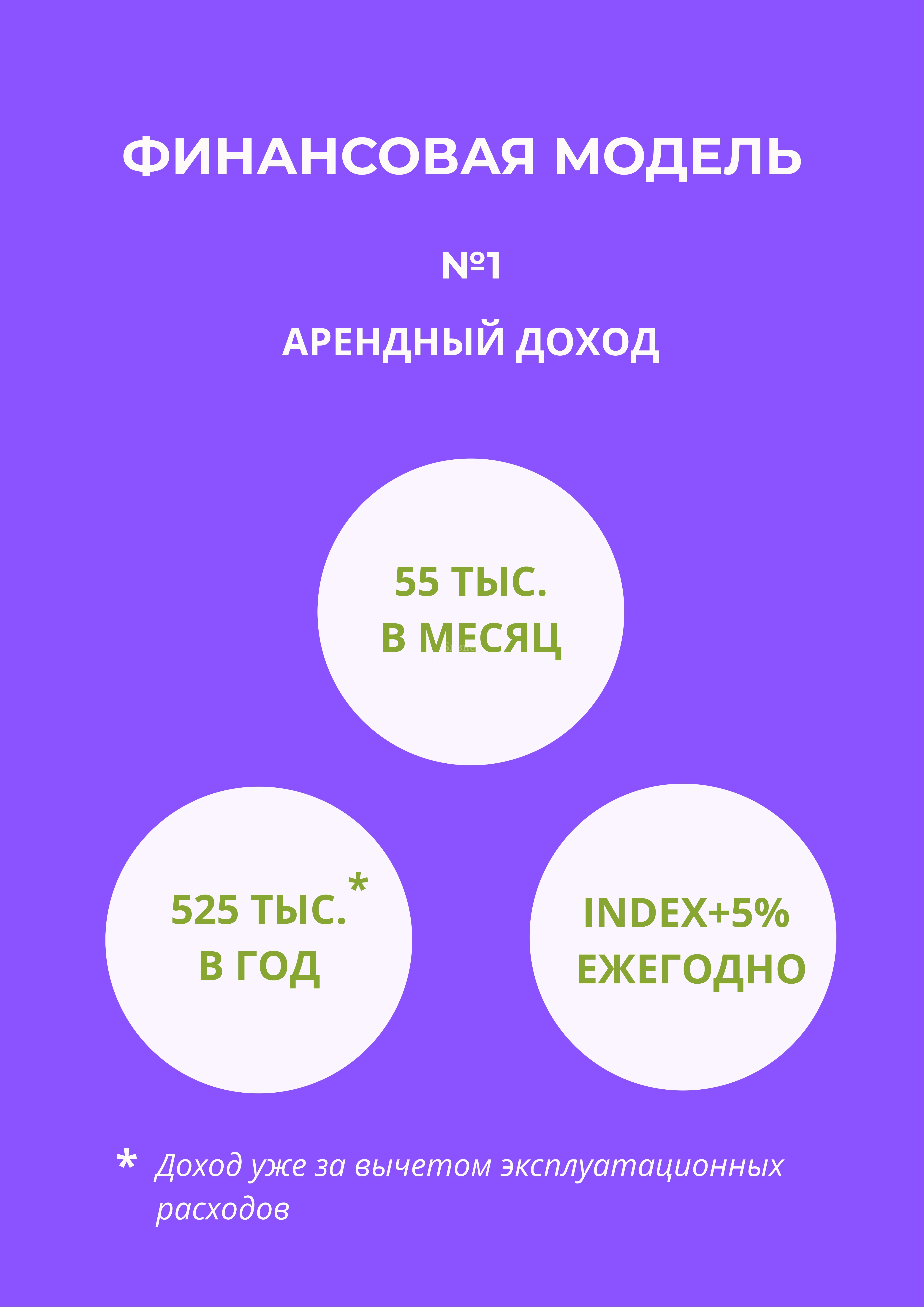 Стабильный якорный арендный поток 55 000рублей в месяц, годовая доходность 525 000 рублей, за вычетом эксплуатационных расходов