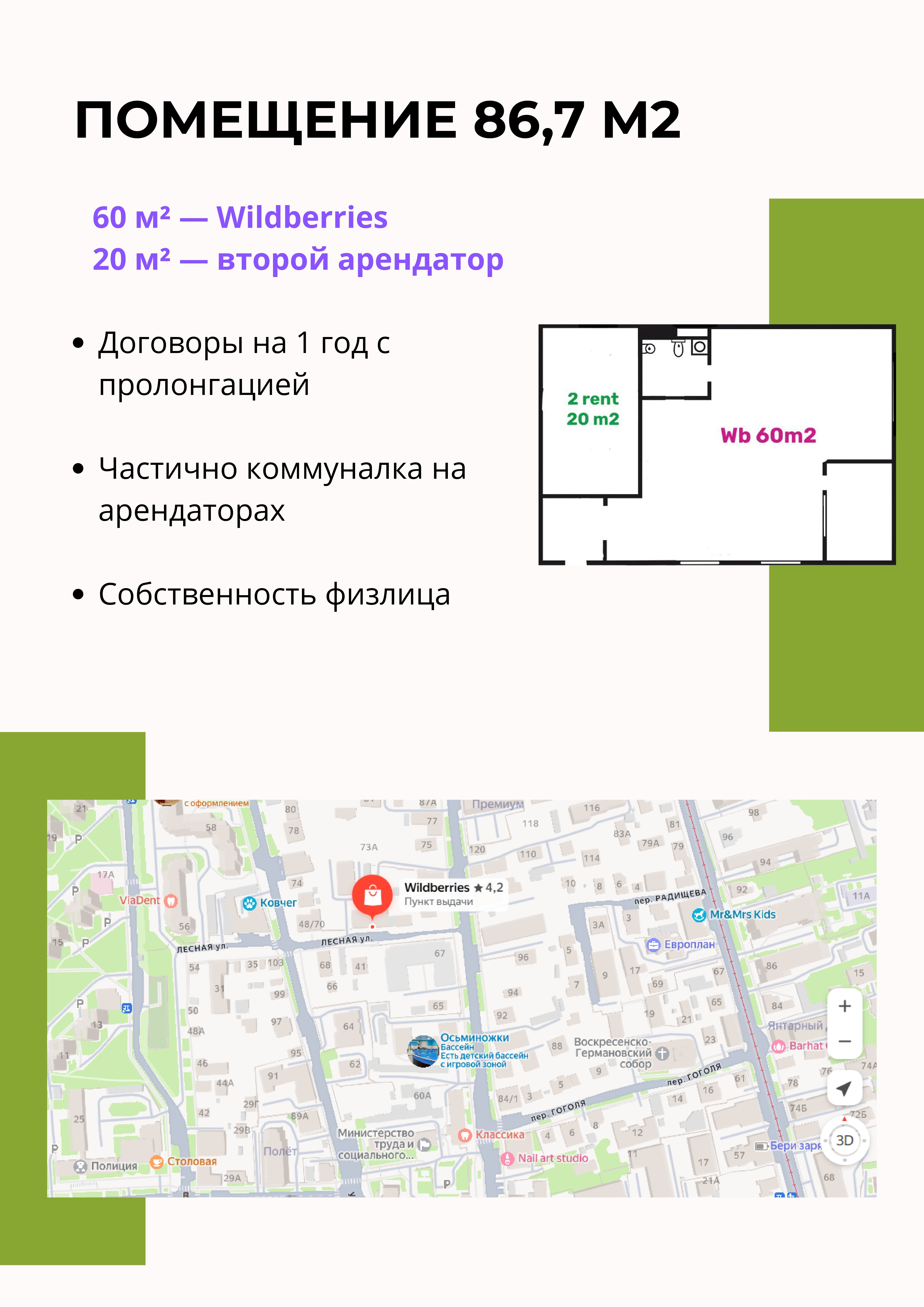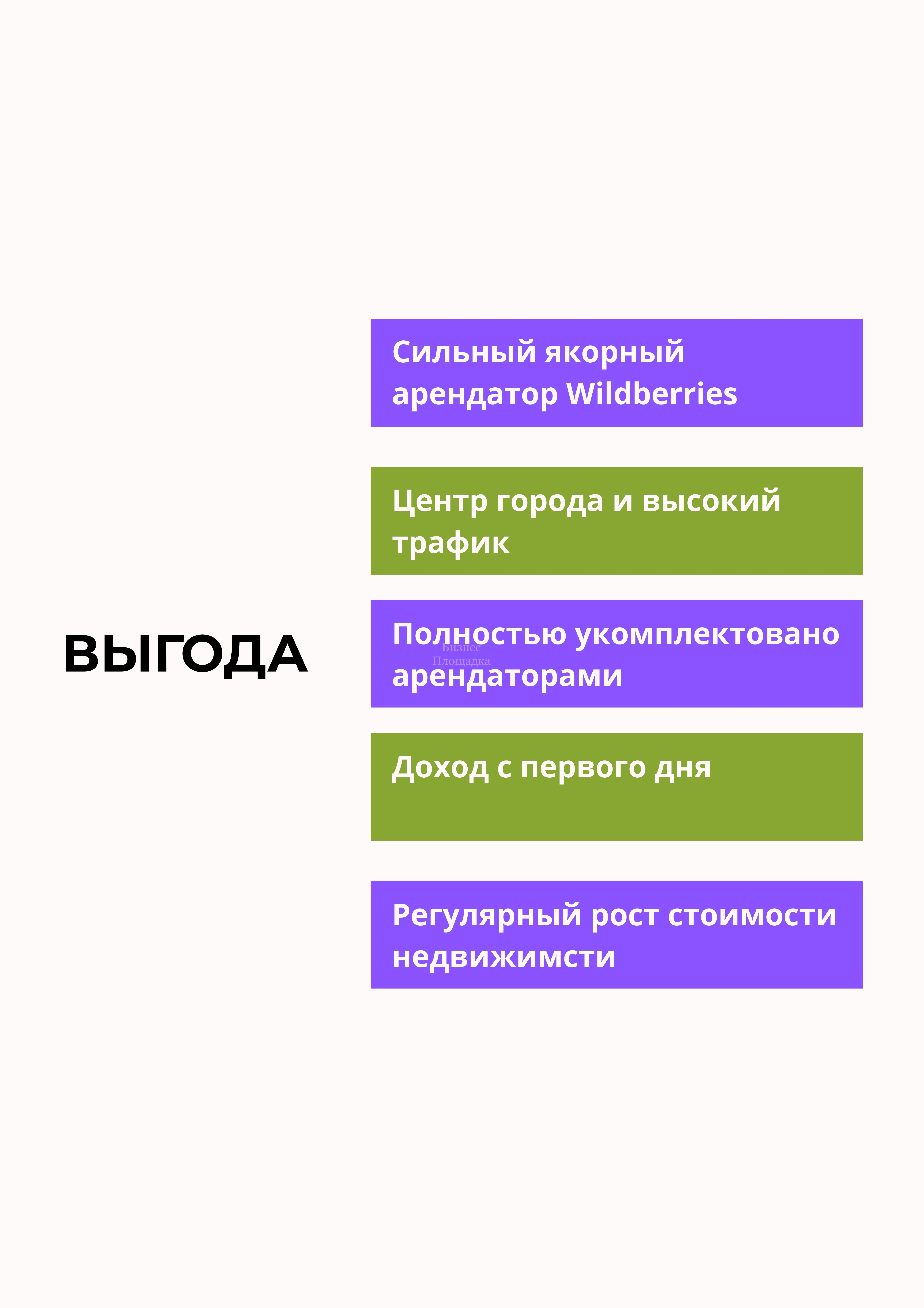 Примечание: Помещение продаётся как арендный бизнес, на данный момент арендатор Wildberries, стабильный арендный поток.